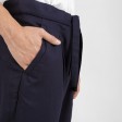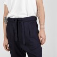 These relaxed fit trousers are made of premium wool with a curved design line. They feature a drop crotch, a waist tie closure and two back pockets.